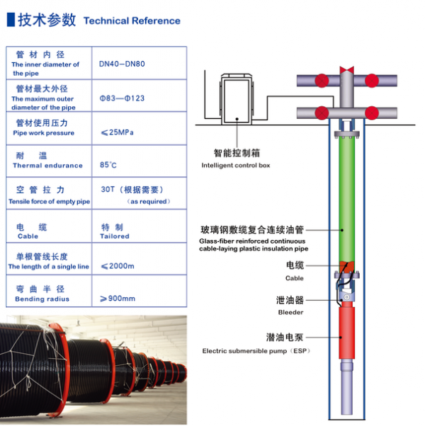 1、一體式電纜集成式玻璃鋼敷纜復(fù)合連續(xù)油管,集輸油,輸送電能及傳輸信號(hào)功能于一體,電纜和管都免維護(hù),設(shè)計(jì)壽命20年以上。